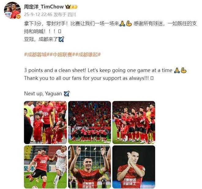周定洋在个人微博中写道:拿下3分,零封对手!比赛让我们一场一场来 感谢所有球迷,一如既往的支持和呐喊!!!亚冠,成都来了✈️