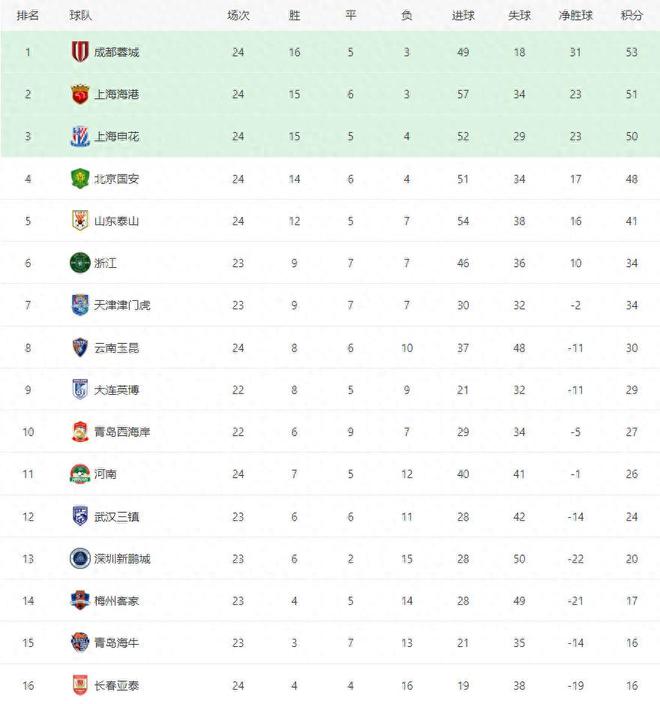 成都蓉城、上海海港、上海申花分列前三,同时分差只有3分,北京国安落后榜首5分,争冠开始掉队。
