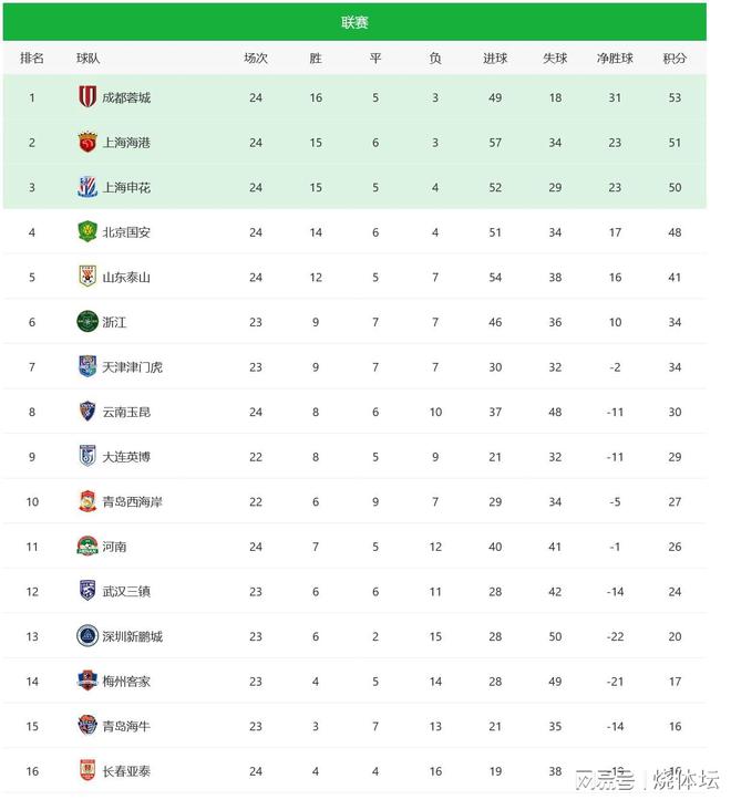 目前联赛来到第24轮,前五名都打完24场,排名相较于上轮发生微小变化。成都蓉城、上海海港和上海申花分列前三,保持争冠胶着局势,而北京国安又掉链子。