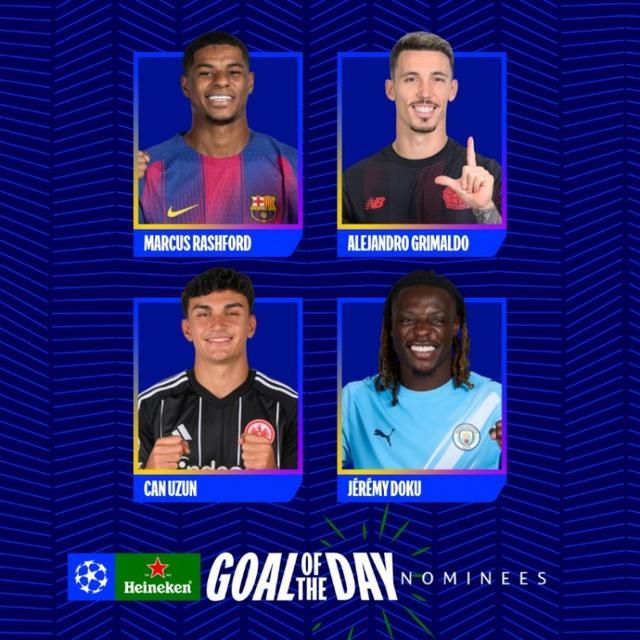 直播吧9月19日讯 欧冠官方列出了今日最佳进球候选名单,拉什福德、格里马尔多、乌尊、多库的进球在列。