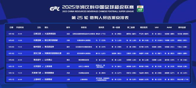 北京时间9月19日,中超联赛第25轮将于今晚打响。根据裁判选派安排表,本轮的2场争冠大战均有外籍裁判主哨,马宁在列,被认定为上一轮出现误判的杜健鑫疑遭内部停哨。