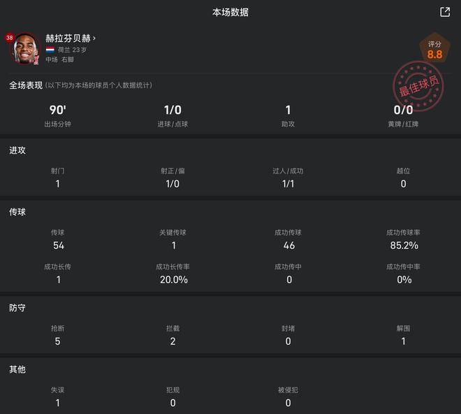传球54脚,到位46次,1次关键传球,传球成功率85.2%;