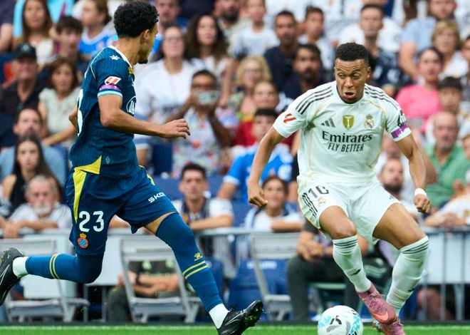 这场比赛皇马率先取得进球。米利唐在第22分钟轰出一脚超远距离世界波!这脚远射真的是太不可思议了!皮球像炮弹一样钻入球门,力量真的是太大了!第34分钟,多兰过掉门将后零角度射门,被挡了出去。7分钟后,姆巴佩在禁区右侧小角度劲射,踢偏了。随后,姆巴佩在禁区中路的包抄射门踢偏了,浪费了维尼修斯的妙传。半场结束,皇马1-0领先西班牙人。