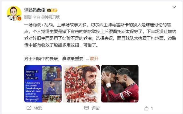 直播吧09月21日讯 本轮英超焦点战,曼联2-1击败切尔西。赛后,评述员詹俊发文点评。
