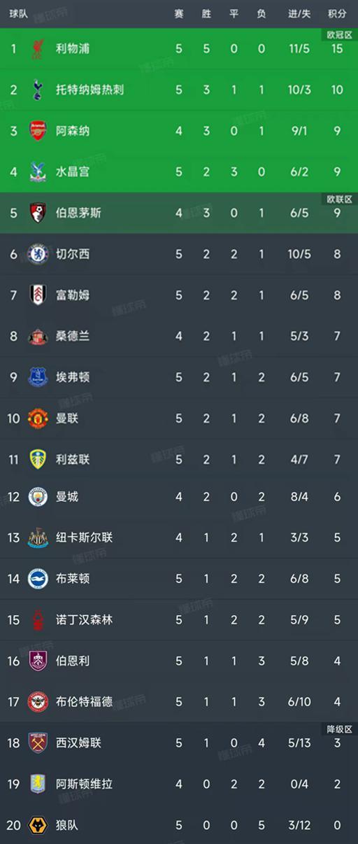 北京时间9月21日,英超第5轮结束了7场比赛,最新积分榜如下,主要的信息如下:利物浦2-1埃弗顿,热刺2-2布莱顿,切尔西1-2曼联,狼队1-3利兹联,西汉姆联1-2水晶宫,伯恩利1-1诺丁汉森林,富勒姆3-1布伦特福德!
