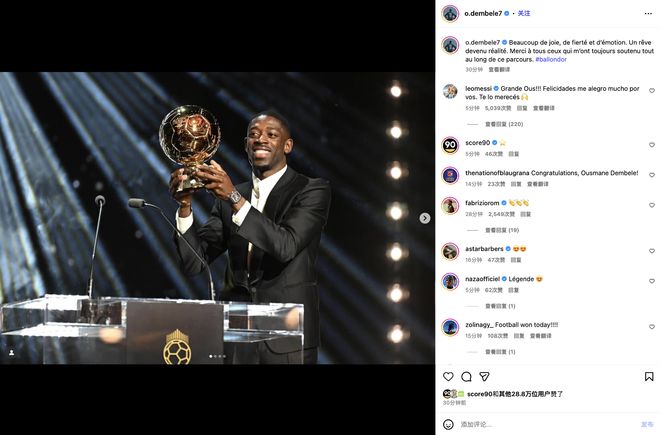 随后八座金球奖得主&前巴萨队友梅西点赞了这则社媒,并现身评论区回复道,“超棒的奥斯曼(登贝莱),祝贺你,我为你感到高兴,这是你应得的。”