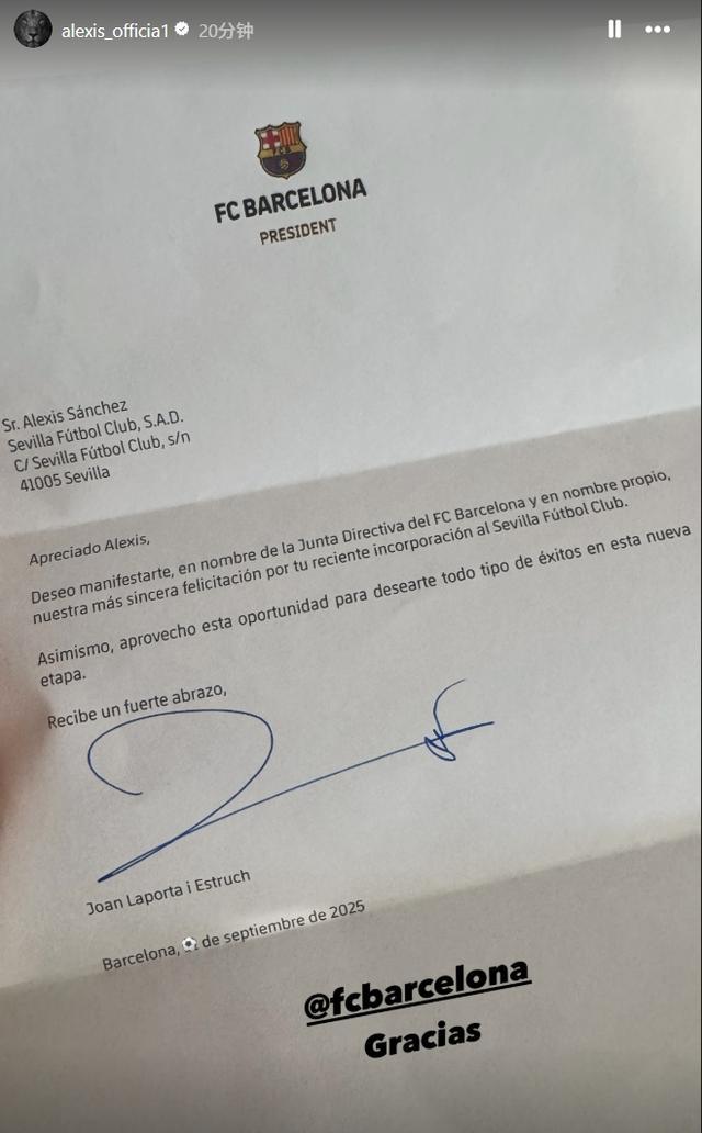 直播吧09月23日讯 36岁的智利前锋、巴萨旧将桑切斯今夏回归西甲加盟塞维利亚。今天他更新社媒,展示了一封老东家巴萨发来的贺信。信中大致写道: