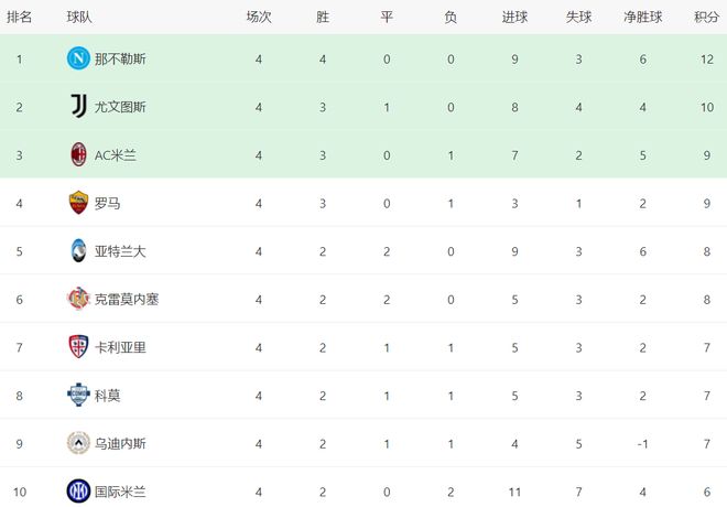 那不勒斯是意甲唯一保持全胜的。排在那不勒斯身后的尤文图斯3胜1平,拿到10分。AC米兰和罗马则只拿到9分。至于另一支夺冠热门球队国际米兰就有些拉胯了,4场联赛只取得2胜2负的成绩,只拿到6个积分,排名第10。孔蒂的目标自然是率领那不勒斯夺冠。不过,难度有点大。毕竟本赛季那不勒斯需要踢强度非常大的欧冠比赛。在多线作战的情况下,以那不勒斯的阵容深度,要想保持稳定的战绩是极其困难的事情。孔蒂能够做到吗?拭目以待!