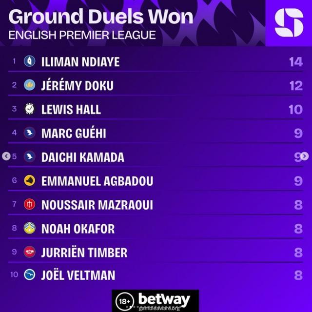 直播吧9月24日讯 英超第5轮战罢,squawkafootball列各项数据排行,埃弗顿边锋恩迪亚耶是赢得地面对抗最多的球员,共计14次。