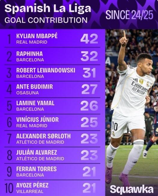 直播吧9月25日讯 本赛季,皇马射手姆巴佩延续了良好的状态,法国人在西甲中已经打进7球。根据Squawka的数据统计,上赛季以来,姆巴佩在西甲直接参与42球位居榜首。