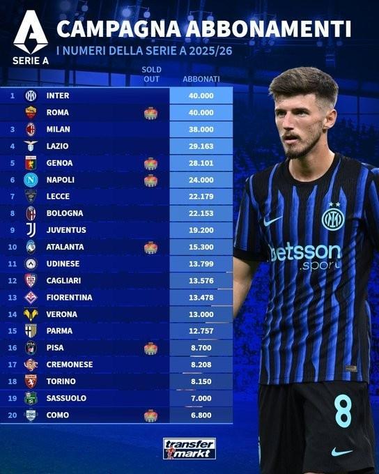 直播吧9月25日讯 2025-26赛季意甲各队季票销售数量榜出炉,其中国米、罗马4万张并列第一。
