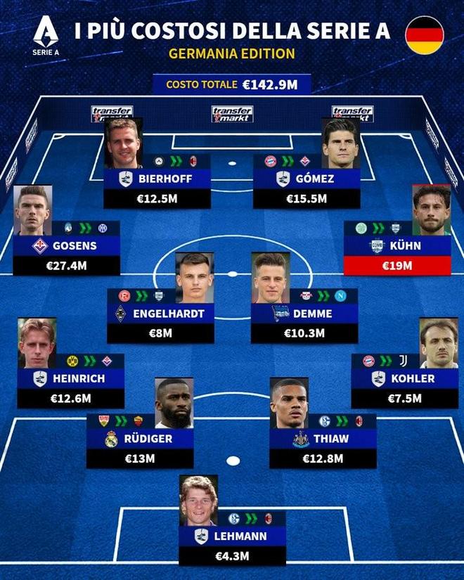 转会市场网统计了德国球员转会至意甲俱乐部身价最高榜单,总身价为1.429亿欧元,其中科莫前锋尼古拉斯-库恩成为第11位上榜球员。