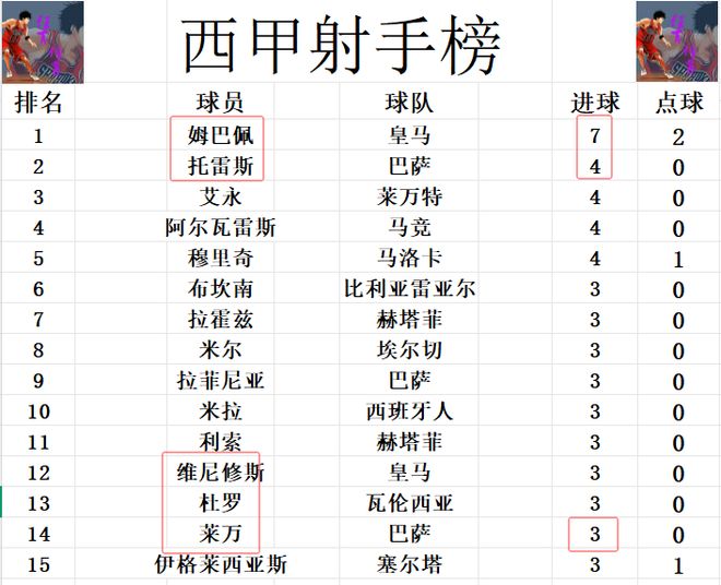 射手榜方面,姆巴佩6轮7球高居榜首,托雷斯今天无力进球,还是和艾永,阿尔瓦雷斯,穆里奇4球并列第2。莱万替补登场破门,追上拉菲尼亚,维尼修斯,米尔等人3球刚好挤入前十。