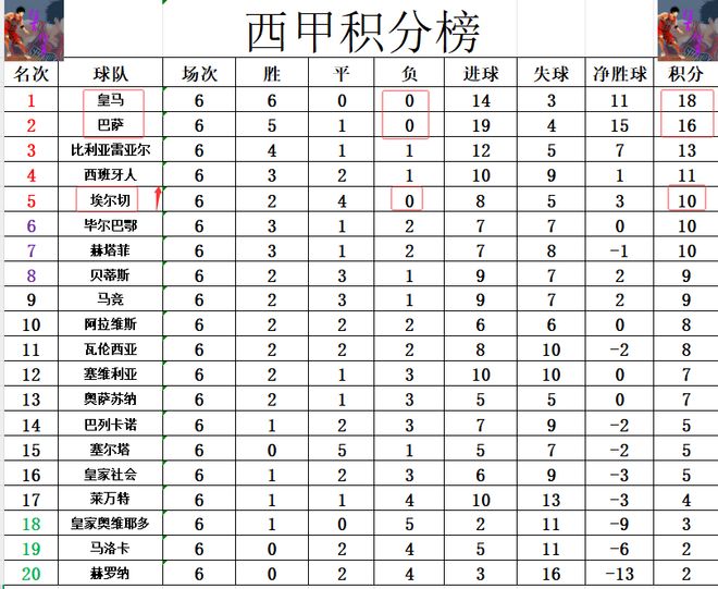 积分榜方面,6轮全部战罢,还是只有皇马保持全胜,巴萨今天逆转赢球后5胜1平保持不败,他们再次将和皇马的差距缩小到只差2分,继续坐稳第2的位置。除了皇马和巴萨之外,还有一支不败的球队,那就是升班马埃尔切,只不过他们平局有点多,2胜4平,净胜球优势超过毕尔巴鄂竞技和赫塔菲升至第10。