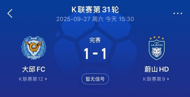 江源FC在主场0-0战平大田市民,下周二,他们将来到成都客战成都蓉城;而蔚山HD则客场1-1战平大邱FC,他们将在下周三客战上海申花。