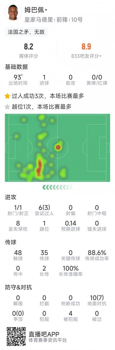 直播吧9月28日讯 在本轮西甲马德里德比,马竞5-2击败皇马。本场比赛姆巴佩破门,以下为他在本场数据:
