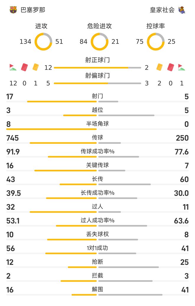 这场比赛里,巴萨在射门方面,以17-5远远凌驾于皇家社会,其中在射正方面则更是以12-2遥遥领先碾压对手。在控球率方面,巴萨也以75%-25%远远压倒于对手。