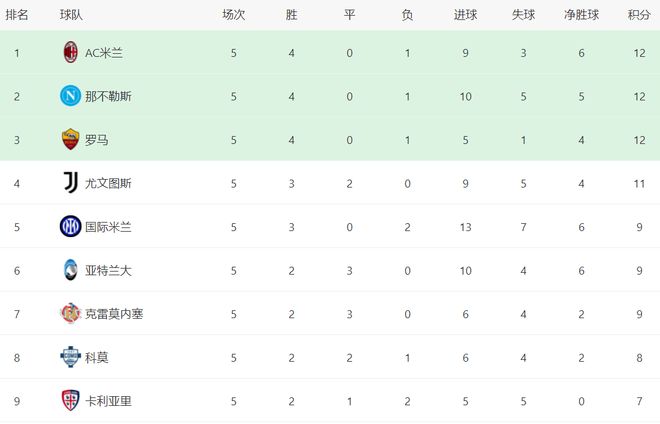在积分榜上,前3名的积分都一样,都是12分。AC米兰赢下那不勒斯之后,以净胜球的优势,排名榜首。那不勒斯5个净胜球,排名第2。第3 的是罗马,4个净胜球。尤文图斯3胜2平的战绩,拿到11分,排名第4。国际米兰以9个积分排名第5。亚特兰大和克雷莫内塞也是9分。拉齐奥的战绩就非常差了,1胜3负,只拿到3分,排名第14。