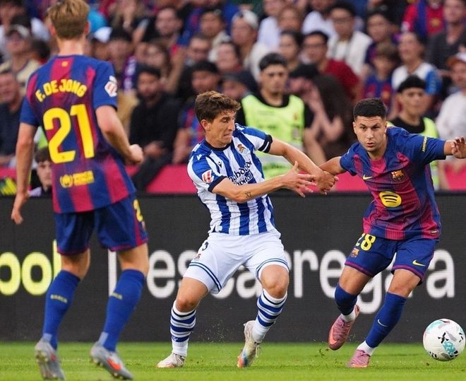 在上赛季巴萨和皇家社会主客场两回合交锋中,两支球队虽然都取得了1胜1负的战绩,但巴萨在主场以4-0血洗了对手,如今再度相遇,弗里克肯定想要延续强势的发挥,在主场沿用了4231的阵型,什琴斯尼镇守龙门,马丁、克里斯滕森、阿劳霍和孔德构筑后防,佩德里和德容搭档双后腰,拉什福德、德罗和巴德吉坐镇中场,单箭头则是莱万。