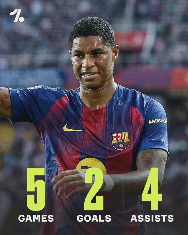 正如上面提到的,这些壮举后来产生了一个令人惊讶的统计数据。根据Opta的数据显示,拉什福德本赛季直接参与进球数达到了6球(2球4助攻),成为弗利克教练阵容中进球参与最多的球员。紧随他身后的则是亚马尔(2球3助攻)、拉菲尼亚(3球2助攻)、费兰·托雷斯(4球1助攻)。