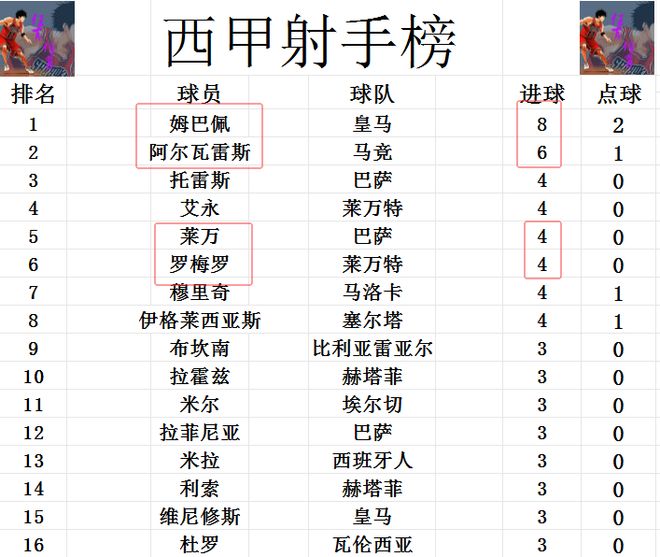 射手榜方面,姆巴佩7轮8球,继续稳居榜首,阿尔瓦雷斯6球紧随其后位列第2。莱万今天无缘双响,打入一球后追上托雷斯,艾永,穆里奇等人4球并列第3。维尼修斯,拉菲尼亚,米尔等人则是3球刚好挤入前十。