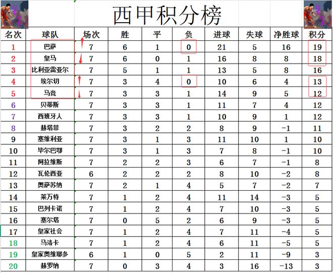 积分榜方面,随着皇马惨败,新赛季就只剩下两支球队保持不败,巴萨今天逆转皇家社会后,1分优势力压皇马逆袭登顶领跑。升班马埃尔切昨晚赢球后,也是继续保持不败,他们3胜4平,1分优势超过马竞挤入前4。
