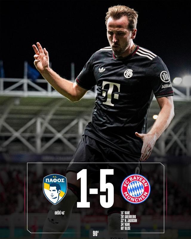 欧冠联赛阶段第二轮,拜仁做客欧冠新军帕福斯。上半场拜仁多点开花,凯恩梅开二度,拉斐尔·格雷罗建功,尼古拉斯·杰克逊打入拜仁处子球。中场休息之前奥尔西奇扳回一城。下半场奥利塞锦上添花。拜仁客场5比1大胜帕福斯。