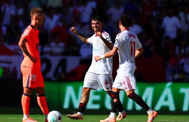 第10分钟,阿劳霍防守犯错,放倒了对手,裁判给了塞维利亚点球。36岁的桑切斯主罚命中,攻破旧主球门。巴萨0-1落后。进球后,桑切斯疯狂庆祝。