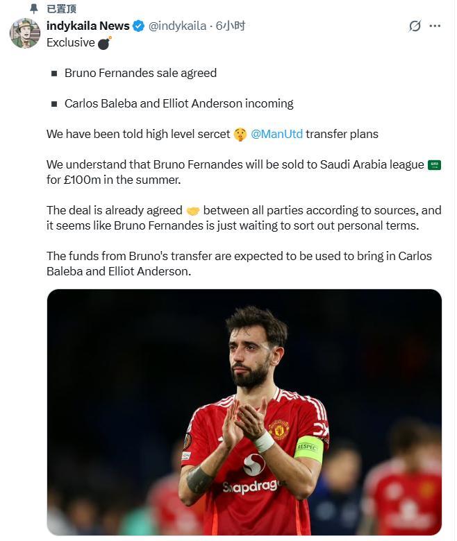来自indykaila News的独家消息透露,曼联已经和沙特联赛的球队达成协议,以1亿英镑的价格出售曼联队长布鲁诺费尔南德斯,也就是B费,目前双方已经达成协议,B费在等待个人条款的处理,曼联将会把这笔转会费投入到巴莱巴和埃利奥特的引援上。indykaila News也就是大家俗称的“绿帽哥”,是著名的转会自媒体,在今年夏窗报道了维尔茨等人的转会消息得到了不少认可。