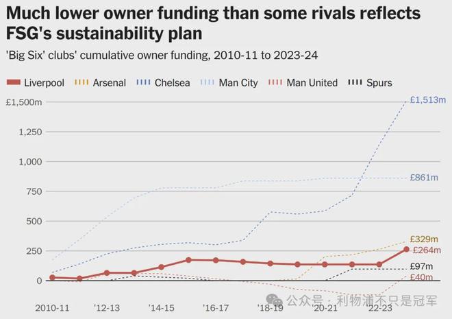 图表:远低于部分竞争对手的所有者注资反映了 FSG 的可持续计划。自 FSG 在 2010-11 赛季初收购利物浦以来,'Big Six' 俱乐部所有者注资的折线图,其中利物浦的 2.64 亿英镑低于其他三家,并显著低于切尔西和曼城。