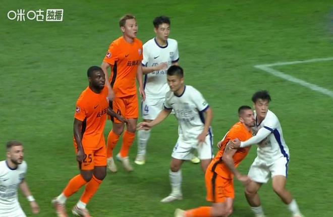 第45分钟,黄政宇禁区外轰出一记世界波,打在程进身上折射入网,泰山客场1-0!