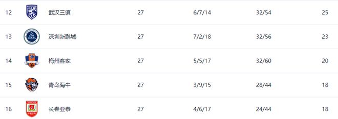 27轮之后,新鹏城以23分排名第13位,梅州客家以20分排名第14位,青岛海牛、长春亚泰同积18分。