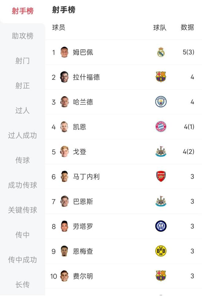 雷速体育10月22日讯 北京时间今日,欧冠单夜九场精彩纷呈的比赛落幕,欧冠的射手榜也有所变动,拉什福德来到了第二,姆巴佩依旧五球居首。