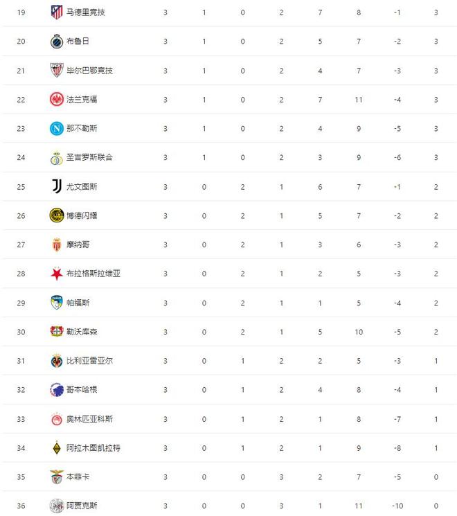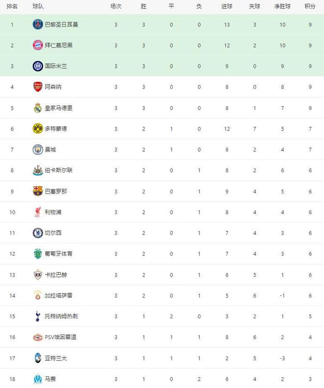 欧冠最新积分榜如下: