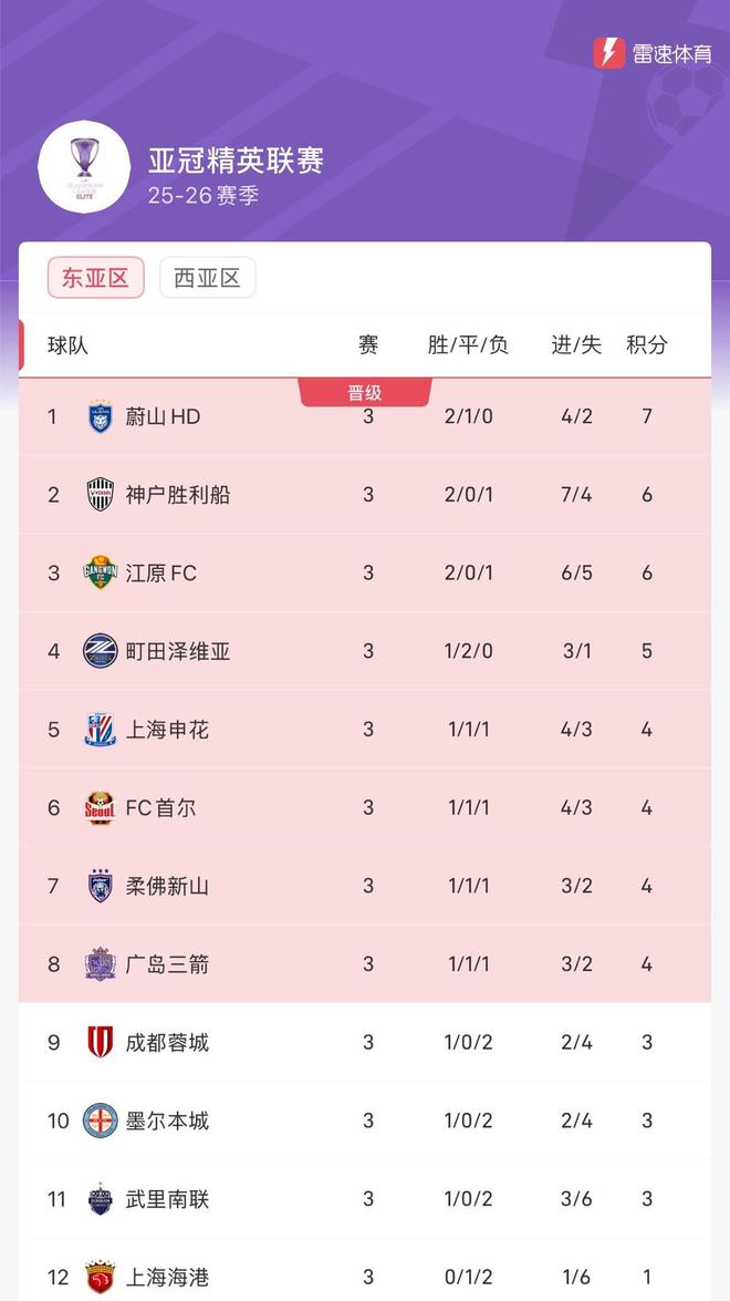 前3轮结束后,最新的亚冠精英联赛东亚区积分榜中,申花第5位列晋级区,蓉城第9,海港垫底。