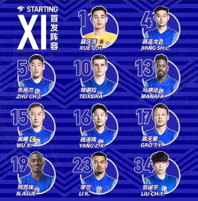 本场比赛,上海申花在首发上派出了1-薛庆浩、4-蒋圣龙、5-朱辰杰、13-马纳法、16-杨泽翔、15-吴曦、17-高天意、23-李可、10-特谢拉、19-阿苏埃、34-刘诚宇