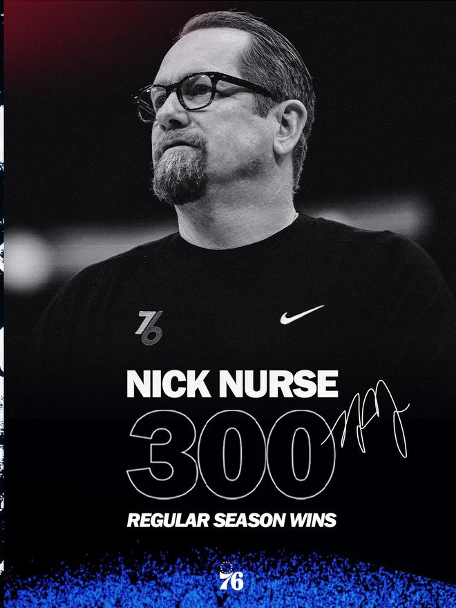 北京时间10月26日,NBA常规赛76人125-121战胜黄蜂。本场比赛结束后,76人主帅纳斯也迎来了自己执教生涯的第300场胜利。