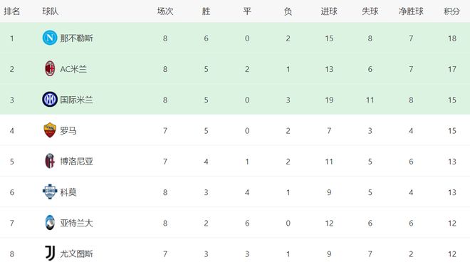 在积分榜上,随着那不勒斯击败国际米兰,导致榜首易主。那不勒斯6胜2负,拿到18分,登上了榜首位置。而AC米兰总积分是17分,掉到了第2名。国际米兰依然是15个积分,排名第3。第4的是罗马,也是拿到15分。博洛尼亚和科莫都是13分,排名第5和第6名。亚特兰大、尤文图斯和乌迪内斯都只拿到12个积分。