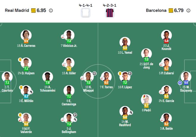皇马首发:1-库尔图瓦(7.1分)、8-巴尔韦德(6.6分)、3-米利唐(8.3分)、24-赫伊森(7.1分)、18-卡雷拉斯(6.4分)、5-贝林厄姆(7.3分)、6-卡马文加(7.1分)、14-琼阿梅尼(7.4分)、15-居莱尔(6.7分)、7-维尼修斯(7.3分)、10-姆巴佩(7.0分)