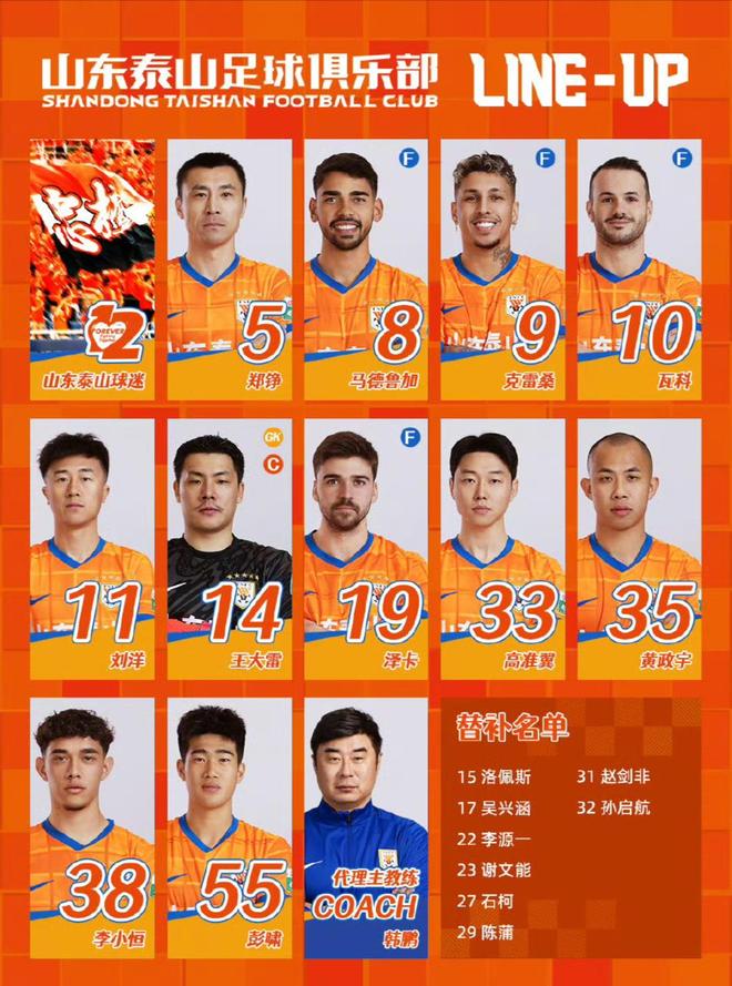 山东泰山首发:14-王大雷、5-郑铮、15-路易斯-洛佩斯(F)、11-刘洋、33-高准翼、35-黄政宇、8-马德鲁加(F)、19-泽卡(F)、38-李小恒、10-卡扎伊什维利(F)、9-克雷桑(F)