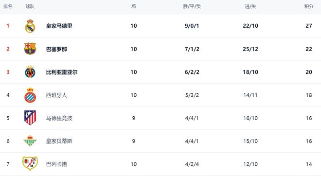 皇马击败巴萨改变了争冠格局。在积分榜上,皇马扩大了领先优势,27分领跑,领先第2名的巴萨5分,占据了夺冠主动权。比利亚雷亚尔以20分排名第3。第4的是西班牙人,拿到18分。马竞4胜4平1负,只拿到16分,排名第5。皇家贝蒂斯也是16个积分,排名第6。