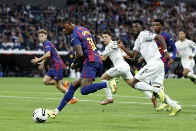 在缺少莱万多夫斯基、拉菲尼亚和奥尔默一众攻击手的情况下,掐死亚马尔就等同于遏制了巴萨的进攻。皇马的逼抢和压迫非常猛烈,巴萨独步足坛的传导很难施展,开场之后便陷入被动,若不是VAR过于明察秋毫,巴萨开场就崩了。