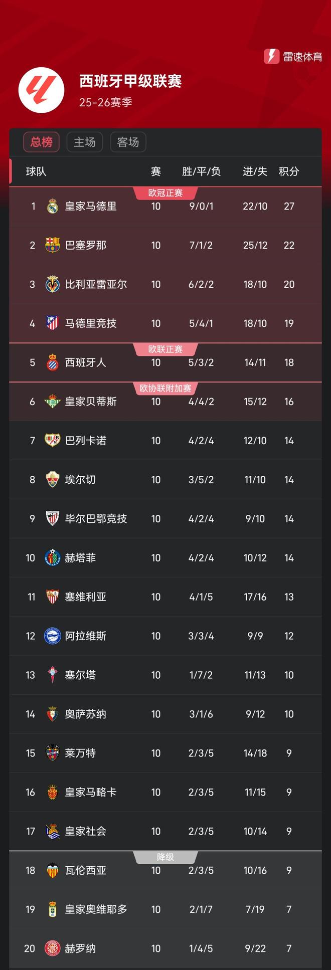 赫罗纳和奥维耶多同积7分,排名倒数前两位。瓦伦西亚、皇家社会、马略卡、莱万特同积9分。