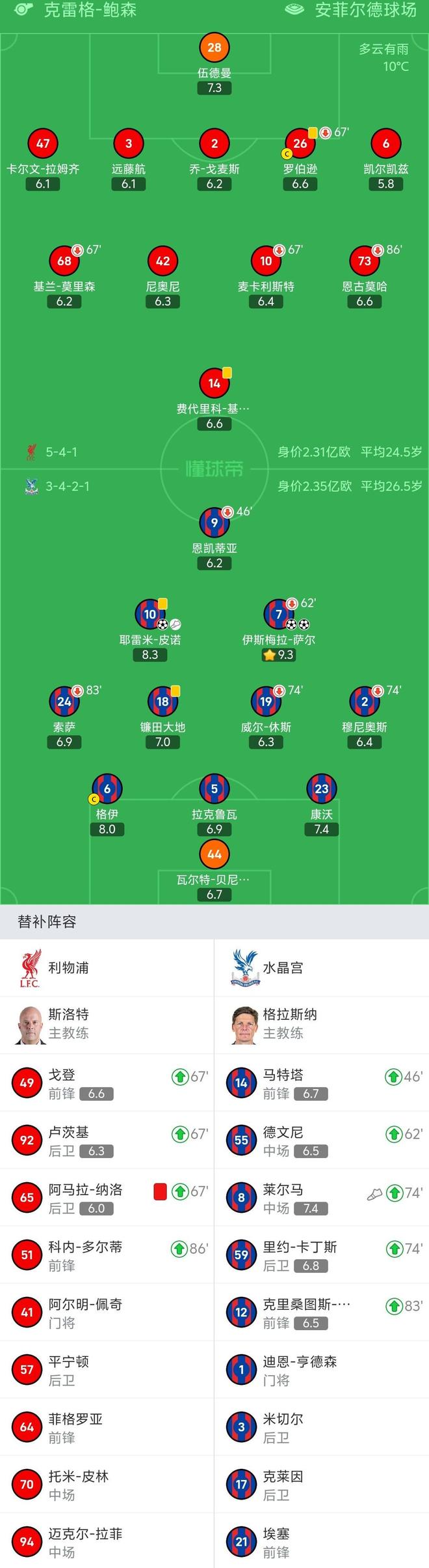 第67分钟,利物浦换人,麦卡利斯特、罗伯逊、莫里森被换下
