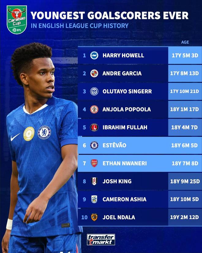 在10月30日的英联杯第四轮比赛中,切尔西小将埃斯特旺与阿森纳小将恩瓦内里分别取得进球。