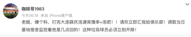 而来自多位媒体人的透露,薛庆浩因为上轮中超与大连英博赛后,去通宵泡吧并且撸串,已经被俱乐部处以“三停”处罚。