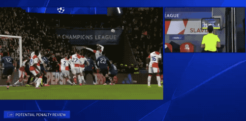 第30分钟,阿森纳再次获得角球,加布里埃尔头球攻门,皮球打在防守球员的身上反弹到了张开的手臂上,VAR介入,裁判判罚点球。