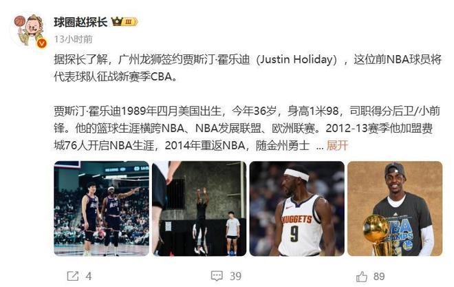 根据国内知名篮球媒体人“球圈赵探长”的报道,NBA冠军后卫、贾斯汀-霍乐迪新赛季将加盟CBA广州龙狮队。上个月的NBA季前赛,贾斯汀-霍乐迪代表广州龙狮队出战3场比赛,场均可以拿到5分3篮板2助攻2抢断的数据。2014-15赛季,霍乐迪随勇士队拿到了1枚总冠军戒指。