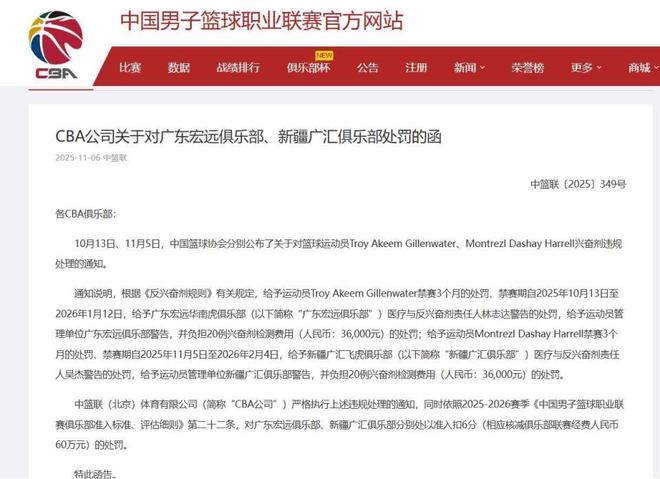 11月6日,篮协公布对上赛季新疆队外援哈雷尔的处罚,由于兴奋剂违规问题,哈雷尔被CBA处禁赛3个月,时间是2025年11月5日至2026年2月4日。球队方面,新疆队需要承担20例兴奋剂检测的费用36000元;对于新疆队的队医、医疗与反兴奋剂负责人吴杰警告处分。