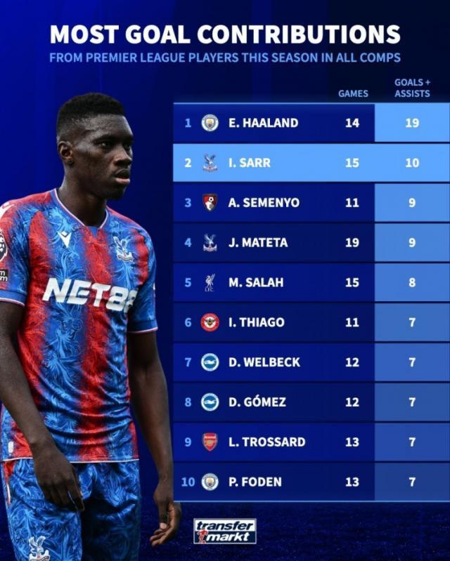 11月7日讯 德国转会市场统计了英超球员本赛季各赛事的参与进球数量,并列出榜单,哈兰德参与19球居首,萨尔参与10球次席。